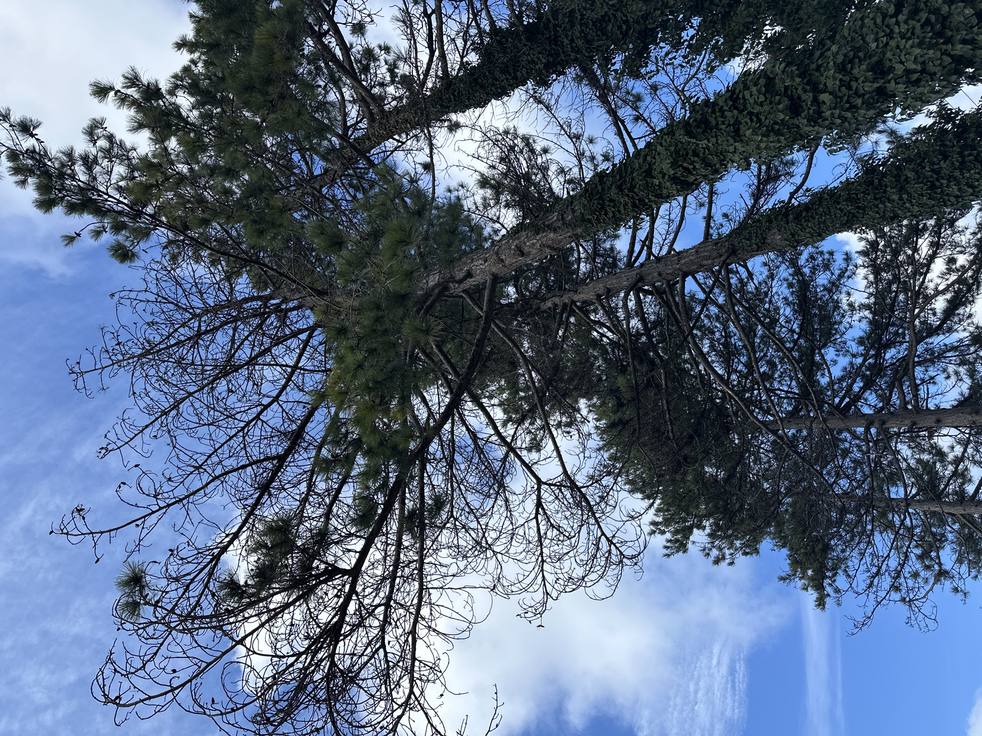 The scene, located in Targovishte, Bulgaria, presents a low-angle view upwards into a blue sky partially obscured by white, wispy clouds. Multiple tall evergreen trees, identifiable as conifers, dominate the frame. The leftmost tree exhibits significant portions of its upper canopy as bare, dark, gnarled branches, devoid of needles, with scattered small cones. Other trees in the mid-ground and foreground feature dense clusters of green pine needles and visible cones. The trunks of at least two trees on the right side of the image are extensively covered with dark green ivy, climbing vertically. No individuals, structures, or artificial objects are present.