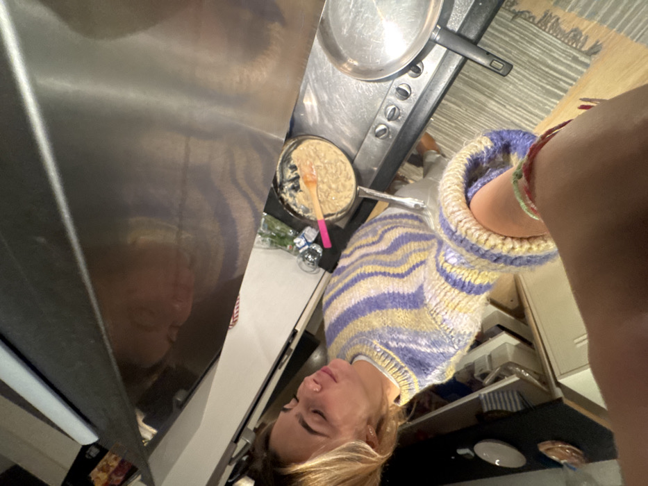 A domestic kitchen scene, located in Eindhoven, Netherlands, depicts a female subject engaged in food preparation. The subject, with light brown hair and a right nostril piercing, wears a distinct purple and yellow horizontally striped knitted sweater. Multiple thin bracelets (red, green, and beige) are visible on her left wrist. She is positioned to the left of a stainless steel stovetop, gazing towards the right, and her reflection is visible in the polished surface of the overhead extractor hood. On the stovetop, a small saucepan containing a light-colored, creamy substance is situated on the front-left burner, with a wooden spoon featuring a pink handle resting within it. An empty stainless steel frying pan with a black handle occupies the front-right burner. The stovetop features visible control knobs. To the left and behind the stovetop, a light-colored countertop displays white plates and other kitchen items. Green leafy herbs are visible in a container on the countertop behind the saucepan. The overall environment appears functional and orderly.