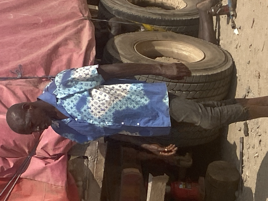 The scene depicts an outdoor setting in Zongon Daji, Nigeria, under direct sunlight, featuring a large commercial truck and two individuals. In the foreground, a dark-skinned adult male with a bald head stands, facing slightly left and looking downwards. He wears a short-sleeved, collared button-up shirt with a distinctive blue and light blue/white pattern incorporating "LV" style monograms and other geometric shapes. His lower body is clad in dark, possibly capri-length trousers or shorts that expose his lower legs. A gold-colored ring is visible on the fourth finger of his right hand, which hangs loosely at his side. Behind and to the right of the standing man is the side of a large truck. Its cargo section is covered by a taut, reddish-pink tarp secured with ropes. Visible underneath the truck's chassis are multiple large, dark-colored tires, and a yellow section of the truck's frame. A red hydraulic jack is positioned under the truck, with wooden blocks supporting it. On the dirt ground, several tools, including what appears to be a wrench or lever, are scattered. Further under the truck, the lower legs and feet of a second, dark-skinned individual are visible, suggesting this person is lying on the ground and working on the vehicle. The ground itself is unpaved, consisting of packed dirt and small debris. No direct interaction between the two individuals is discernibly captured.