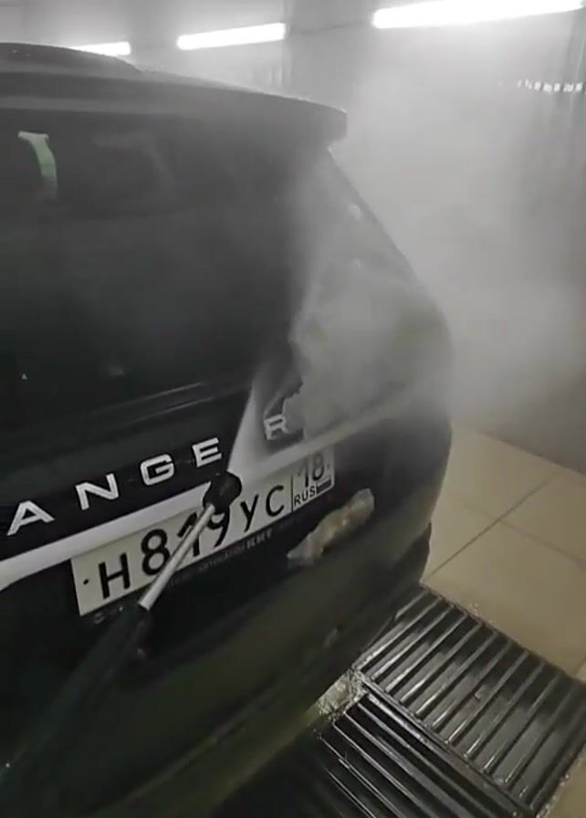 Here's a detailed description of the video: The video shows the rear of a black Range Rover Sport being washed with a high-pressure washer. The vehicle's license plate number is H819YC 18 RUS. A metal grate is visible on the floor where the water is draining. Bright overhead lights illuminate the space, suggesting the scene is taking place in an indoor car wash facility. The camera remains steady as the spray is directed towards the car. The water removes grime and foam from the car's surface. The focus is on cleaning the area around the "RANGE ROVER" lettering and the license plate.