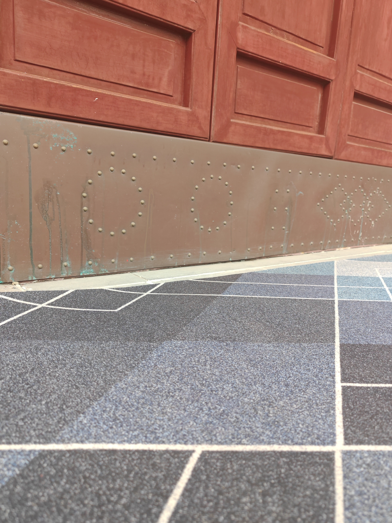 This forensic description details an architectural scene located in Qinhuai District, China. The image is captured from a low-angle perspective, focusing on the base of a building and the adjacent ground. The upper portion displays a deep reddish-brown wooden structure, likely a wall or large door panel, characterized by multiple recessed rectangular panels. Immediately beneath the wooden structure is a lower section constructed from a metallic material, exhibiting a bronze-like hue. This metallic band is adorned with numerous small, brass-colored studs arranged into distinct concentric circular patterns and a diamond-shaped motif on the right. Extensive green-blue verdigris and vertical streaks of oxidation are visible on the metallic surface, particularly towards the left. The foreground features a textured, granular paved ground, composed of alternating dark grey and light blue-grey rectangular sections. These sections are clearly delineated by thin white lines, forming a geometric grid pattern. No individuals, actions, or direct interactions are present within the frame, presenting a static environment.