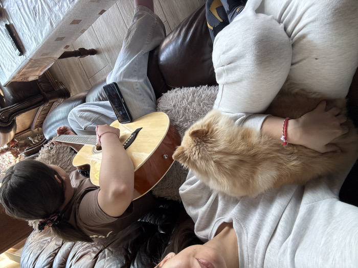 The image depicts an indoor domestic scene in Razlog, Bulgaria, featuring two individuals and one cat. In the foreground, the upper torso and face of an adult female are partially visible. She wears a light grey long-sleeved sweatshirt and light grey sweatpants. Her left arm embraces a fluffy orange cat resting on her lap, and a red and white string bracelet is visible on her left wrist. To the right and slightly further back, a younger individual with dark hair, tied back with a patterned scrunchie, is seated on a dark brown, textured sofa. This individual wears a brown t-shirt and light blue jeans, and is holding and manipulating a light-colored acoustic guitar. A red string bracelet is visible on her right wrist. A black smartphone rests on her left thigh next to the guitar. The room features light wooden flooring, a dark ornate wooden furniture piece partially visible on the right, and a white-covered surface, possibly a table, in the far right foreground with two remote controls on it. The scene is illuminated by natural light.