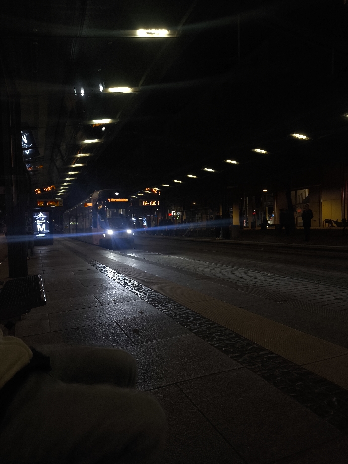 The image depicts a nighttime urban scene at a tram station, specifically the tram hub located beneath the forecourt of Dresden Hauptbahnhof in Dresden, Germany. In the immediate foreground, to the lower left, the blurred knees of a person, covered in light-colored fabric, are visible, suggesting a first-person perspective from someone seated. A dark metal bench is partially visible to the left. The ground is paved with light-colored square tiles, featuring a textured dark gray strip running parallel to the tram tracks, demarcated by a yellow line near the edge of the platform. The midground is dominated by a tram approaching from the left, its bright headlights creating significant lens flare across the image. The tram's front display clearly indicates "4 Weinböhla" as its route and destination. Multiple tram tracks, paved with cobblestones, are visible between the platforms. To the left, a tall, illuminated sign displays a large "N" and a smaller "M", likely part of station or public transport information. The entire area is covered by a large overhead structure, likely an underpass or part of the station architecture, from which numerous evenly spaced rectangular lights illuminate the scene. In the background, further down the platform, several indistinct figures are visible standing. Additional building entrances and commercial establishments are dimly lit beyond the platform. On the far right, a solitary individual stands near what appears to be miscellaneous objects or refuse. The overall environment is dark, with artificial lighting being the primary source of illumination, highlighting the tram and platform areas.