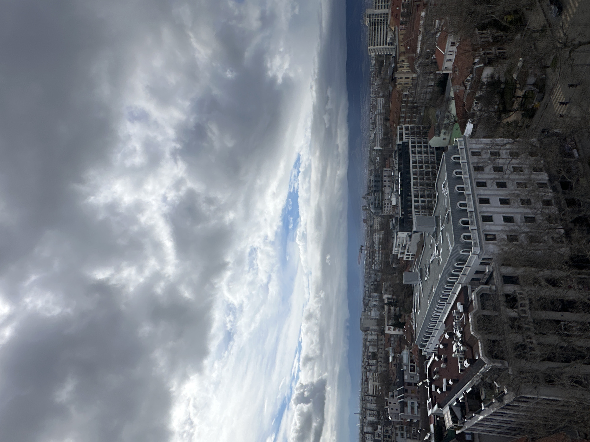 The image presents an elevated panoramic view of the city of Plovdiv, Bulgaria, under a predominantly cloudy sky. The sky occupies approximately the upper two-fifths of the frame, displaying dense, dark grey cumuliform clouds interspersed with patches of lighter grey and some visible blue sky, particularly towards the left horizon. In the distant background, a range of dark, undulating mountains extends horizontally, partially obscured by haze and low-hanging clouds. The cityscape fills the lower portion of the image, characterized by a dense arrangement of buildings with varying architectural styles and heights. In the mid-ground, a prominent, light-colored, multi-story building with a distinctive dark grey mansard roof featuring evenly spaced arched dormer windows is visible. Adjacent to it on the left, another large building with a flat, dark reddish-brown roof, covered with numerous ventilation or air conditioning units, stands. Its facade is partially obscured by the bare branches of deciduous trees. Further to the right, several older residential structures with reddish-brown tiled roofs are present, surrounded by bare trees. A street with a pedestrian crosswalk is discernible in the lower right section of the image, with a few dark vehicles parked or moving. Several small, dark human figures, identified as pedestrians, are visible on the sidewalks. In the far-right distance, a red and white construction crane extends above the city skyline. The overall environment suggests a late winter or early spring season due to the bare trees.