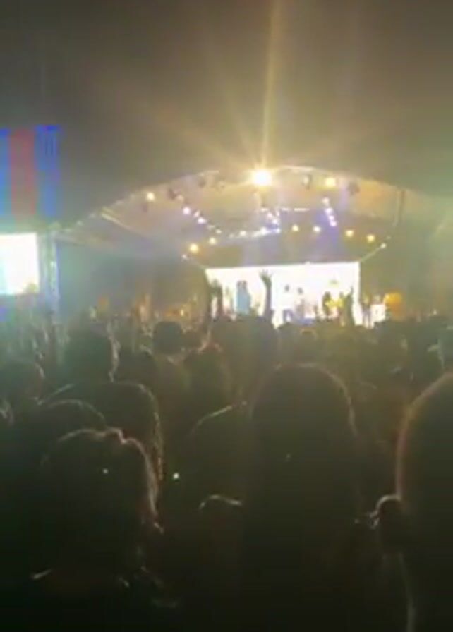 A crowd of people is gathered at a concert venue. The lighting from the stage washes over the audience, illuminating their silhouetted figures. The stage features multiple performers. A large screen displays images, and various lighting fixtures are visible overhead. The camera perspective is from within the crowd, looking towards the stage. The event appears to be lively, with many people present.