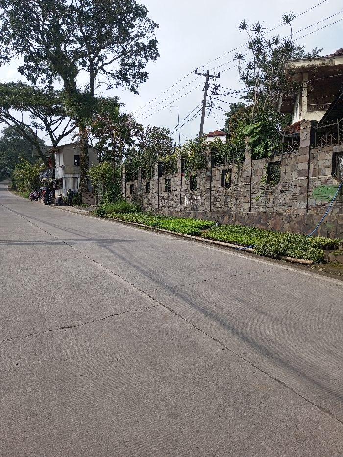 The image captures a street scene in Sandamal Eliya, Sri Lanka, under an overcast sky. A gray concrete road with visible cracks and expansion joints dominates the foreground, extending into the background with a slight uphill inclination to the left. Long, faint shadows are cast across the road from the right. On the left side of the road, a narrow dirt shoulder precedes a gathering of approximately 3-5 individuals standing or sitting near at least two parked motorcycles. Behind them, a two-story building with light-colored siding and a brown roof is partially visible, nestled among large, mature trees. On the right side of the road, a strip of manicured green ground cover plants runs parallel to the pavement. Immediately behind this foliage is a textured stone wall, approximately two meters high, constructed from irregularly shaped dark and light gray stones. The wall features several rectangular recesses, some containing decorative metalwork or grates, while others are overgrown with foliage. A blue hose or cable runs horizontally along the base of this wall. Above the wall, parts of a multi-story building with a reddish-brown roof and light-colored facade are visible, along with decorative iron railings. A wooden utility pole supporting multiple power lines stands behind the wall, and various trees and tall, spiky plants rise above the structures on this side.
