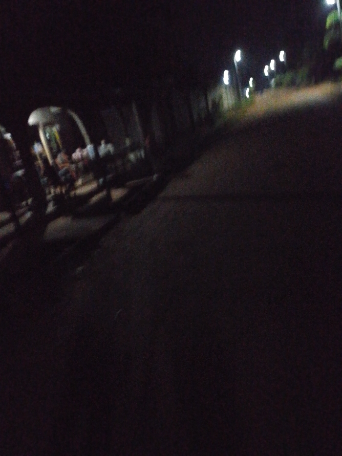 A dimly lit night scene features a street with scattered streetlights fading into the distance. On the left, there's a structure with an arched roof, possibly a shelter or bus stop, where people are gathered. The street itself appears dark and uneven, with shadows cast by the nearby objects and the distant lights. The overall atmosphere is quiet and somewhat eerie due to the limited visibility.