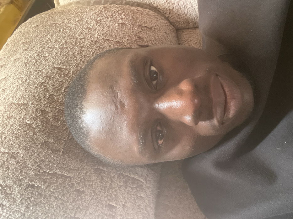 The image presents an overhead, close-up forensic view of a single individual, a male of African descent, located in the city of Jos, Nigeria. He possesses a dark complexion, short, closely cropped dark hair, and is looking directly into the camera with a neutral expression. A distinct scar or raised mark is visible on his forehead. He is wearing a dark, long-sleeved garment, likely a sweatshirt. The individual is positioned reclining, with his head resting against a light brown or beige, heavily textured fabric surface, consistent with upholstery or a pillow. No other specific objects or environmental details are discernible beyond this immediate background.