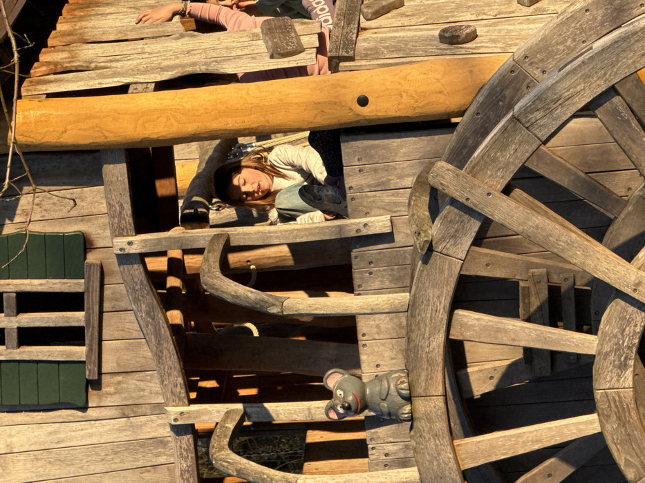 This image captures a multi-level wooden playground structure in Olingen, Luxembourg, illuminated by strong natural light from a low sun angle. A young girl with light brown hair, wearing a light-colored long-sleeve top and light blue pants, is seated within a rectangular opening on the mid-level of the structure. Her left foot, encased in a dark shoe, is visible. She looks slightly downwards and to the right with a neutral expression. To the far right, a partial view of another individual shows their lower torso and a raised right arm; they are wearing a pink top with a white "adidas" logo and dark leggings. In the lower-left foreground, a grey, cartoonish mouse figurine with red ears and a pink nose sits upright on a horizontal wooden beam. Below this, a large wooden wheel-like structure with radial spokes forms part of the base. A long, vertical, yellow-orange wooden pole extends upwards on the right side of the frame, featuring a small, dark circular plug or bolt head. The wooden structure exhibits various planks, beams, and railings. An upper section of the structure includes a small window with dark green shutters. Sparse, bare tree branches are visible against the sky in the upper portion of the image.