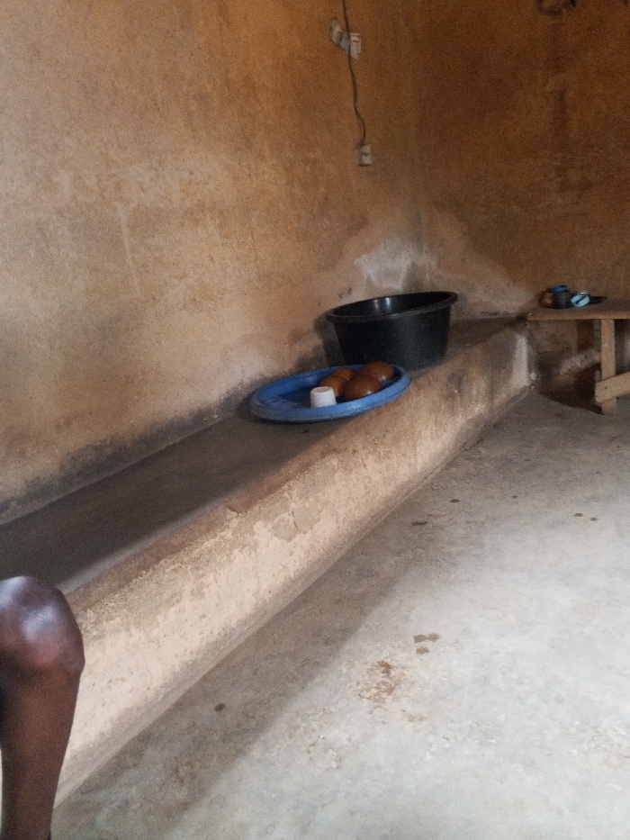 This interior scene, located in Du, Nigeria, features a room with rough, light brown walls exhibiting discoloration and a grey concrete floor with visible stains. A raised concrete ledge spans the length of the left wall. On this ledge, a black plastic basin rests behind a blue plastic tray. The tray holds five brown, spherical objects and one small white cylindrical item. Exposed electrical wiring with components hangs loosely from the upper right wall. In the far right background, a low wooden bench supports two small, indistinct items, possibly footwear. A dark-skinned human leg is partially visible in the lower-left foreground. No actions or interactions are depicted.