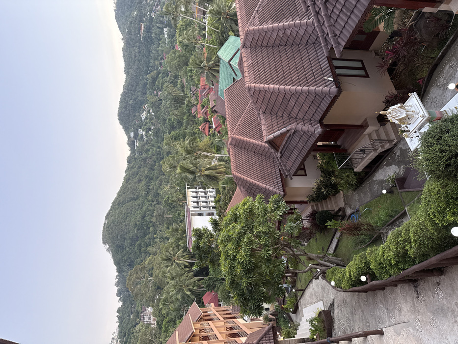 An aerial-perspective image captured in Baan Sri Thanu, Thailand, depicts a tropical resort landscape. The foreground and mid-ground feature a complex of multi-story and single-story buildings with characteristic brown tiled roofs. To the immediate left, a multi-story building with light orange facades and balconies is visible. Dominating the lower and mid-right are several single-story bungalows, each with a steeply pitched brown tiled roof, light-colored walls, and dark-framed windows. Steps with metal handrails lead up to the entrances of some bungalows. Winding concrete pathways, some with a pebbled texture, connect the buildings and are bordered by manicured hedges and lush green grass. Spherical white garden lamps are strategically placed along these pathways and within the shrubbery. A prominent, large, leafy green tree is centered in the mid-ground, surrounded by lower vegetation. In the lower right, a white and gold Thai spirit house (san phra phum) stands on a decorated pedestal. Further in the mid-ground, a modern, multi-story white building with dark, rectangular windows is situated amidst dense palm trees and other tropical foliage. Beyond the immediate resort structures, numerous smaller residential buildings with varying colored roofs (red, green) are scattered throughout a heavily forested valley. The background is dominated by lush, green, forested hills and mountains that rise under a clear, pale blue sky, indicating either early morning or late afternoon conditions. No individuals are visible within the frame.