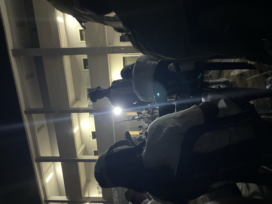 A nighttime shot shows a group of people in front of a multi-story building. They appear to be seated, possibly attending an outdoor event or gathering. The building is illuminated by several lights under the eaves. Some of the individuals wear vests with visible writing. The overall image is somewhat dark, making it difficult to discern specific details.