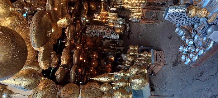 A cluttered shop displays handcrafted metal lamps and lanterns. Golden lamps, many with spherical or elongated shapes and perforated designs, hang closely together. Silver lanterns sit on a shelf, exhibiting similar intricate patterns. The dimly lit interior creates a warm glow from the lamps, contrasting with the cooler tones of the silver items and the concrete floor. The scene suggests a traditional artisan workshop or a bustling marketplace stall.