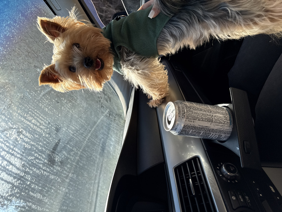 Inside a vehicle located in Prisovo, Bulgaria, a Yorkshire Terrier dog stands upright on its hind legs, with its front paws resting on the car's dashboard. The dog has tan fur on its head and upper body, and grey fur on its lower body and legs, and is wearing a dark green harness or vest. Its mouth is open slightly, and its ears are perked. A human hand with white manicured fingernails is visible on the dog's left side, near its back. In the foreground, an aluminum beverage can, predominantly silver with black and red text, is secured in a pull-out cup holder on the center console. Visible text includes "CARNITINE" and "ТАУРИН". The console features dark grey and silver trim, an air vent, and a circular control knob. The vehicle's windshield is visible in the background, appearing heavily frosted or streaked, reflecting bright sunlight. Blurred green and brown hues beyond the windshield suggest outdoor foliage under daylight conditions.