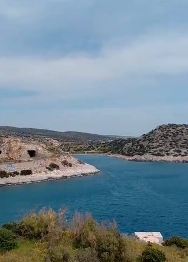 The camera pans across a coastal scene, featuring a body of water, rocky peninsulas, and a partly cloudy sky. On the left peninsula, there are openings resembling tunnels or caves, with some graffiti visible along the lower edge. The water appears blue and calm. The right side of the view reveals a rocky hill and a glimpse of a distant town or settlement nestled along the coast. In the foreground, there's green vegetation and a small, white rectangular structure or object on the grassy land.