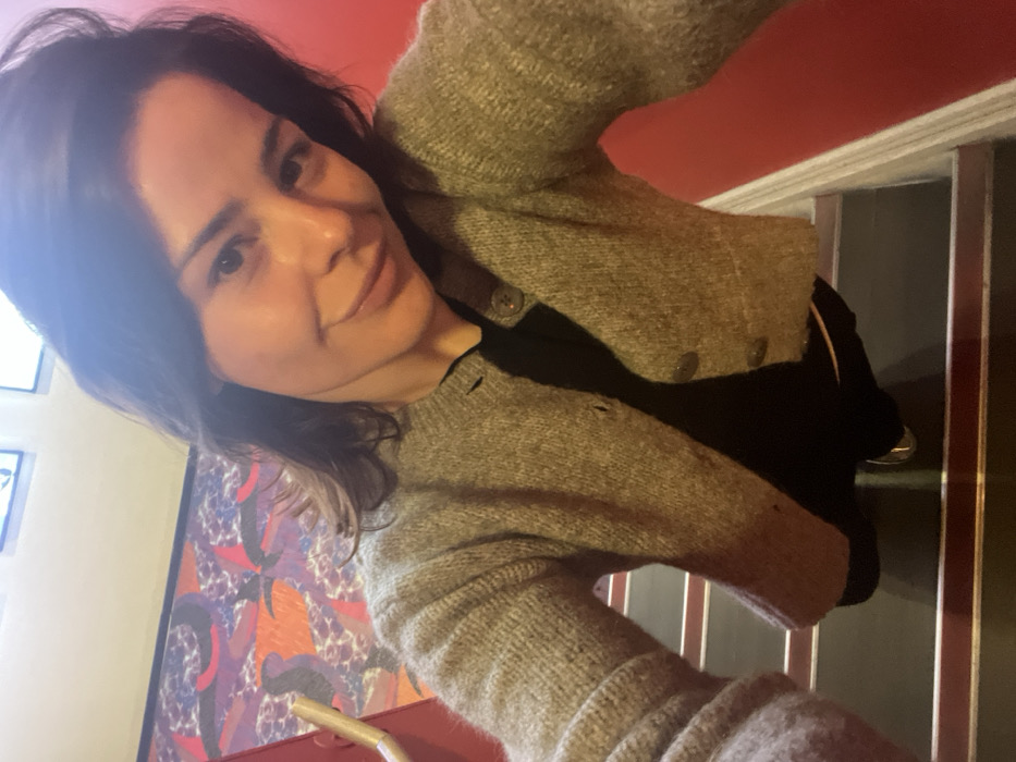 A woman poses for a selfie indoors. She is angled to the left, wearing a light-grey cardigan over a black garment. Her dark hair is casually styled. Background elements include a colorful, abstract artwork, possibly a painting, on the left and a staircase to the right with dark steps and white risers, the wall above painted red. A window is visible to the upper left with the sky outside.