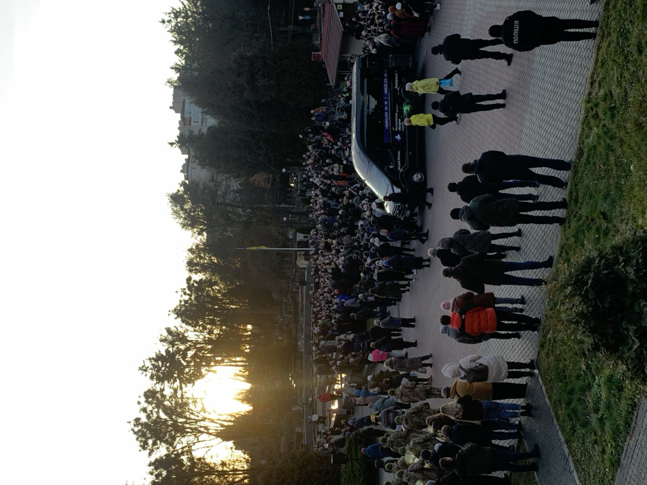 The image depicts a large outdoor gathering, identified as a funeral or memorial procession, within Lychakiv Cemetery in Lviv, Ukraine