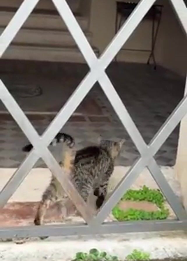 small, tabby cat viewed through a gray metal gate with a diamond-shaped pattern. The cat is standing behind the gate, looking up at the building in the background. The building has a tiled porch with steps leading up to the entrance. There is a small table and chair visible on the porch. The cat meows and looks around, then curls up and sits down.