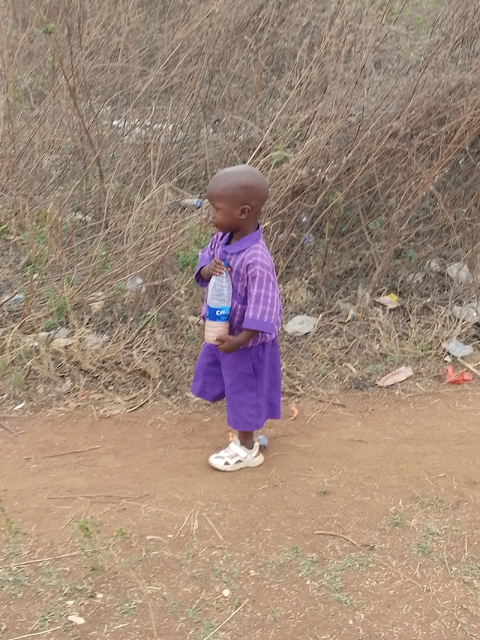 A young child, approximately two to four years old, with dark skin and a shaved head, stands on a reddish-brown dirt path in Oduma Hill, Nigeria. The child wears a short-sleeved, collared purple shirt with light vertical stripes, matching solid purple shorts, and white chunky sandals. The child holds a clear plastic bottle containing a light brown liquid, with a blue label visible displaying "CWS." The child faces left, looking slightly upwards. Behind the child is dense, dry, brownish-red vegetation, interspersed with scattered litter including plastic bottles and wrappers. The ground also exhibits sparse patches of green grass.