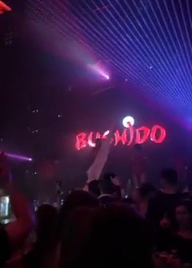 crowd of people at a nightclub or concert, dancing under flashing red, blue, and white lights. The word "Bushido" is displayed in neon red letters above the crowd. Some people are waving white flags. The video is shaky and the focus shifts between the crowd and the lights.