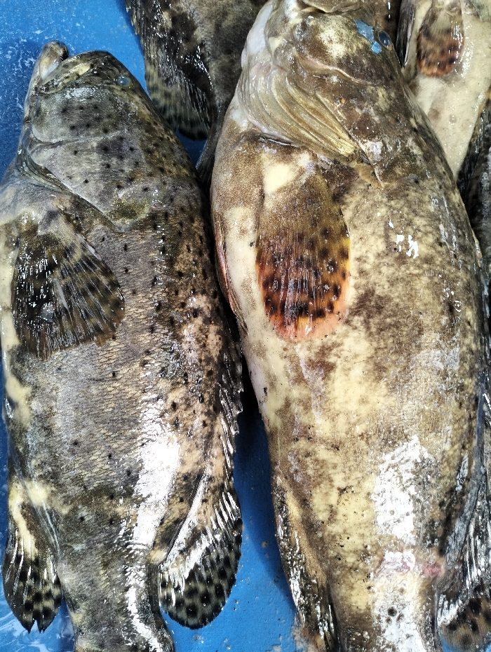 - "The image displays at least three deceased, whole fish, likely groupers, resting on a bright blue surface" by FM-sAcf03, licensed under CC BY 4.0