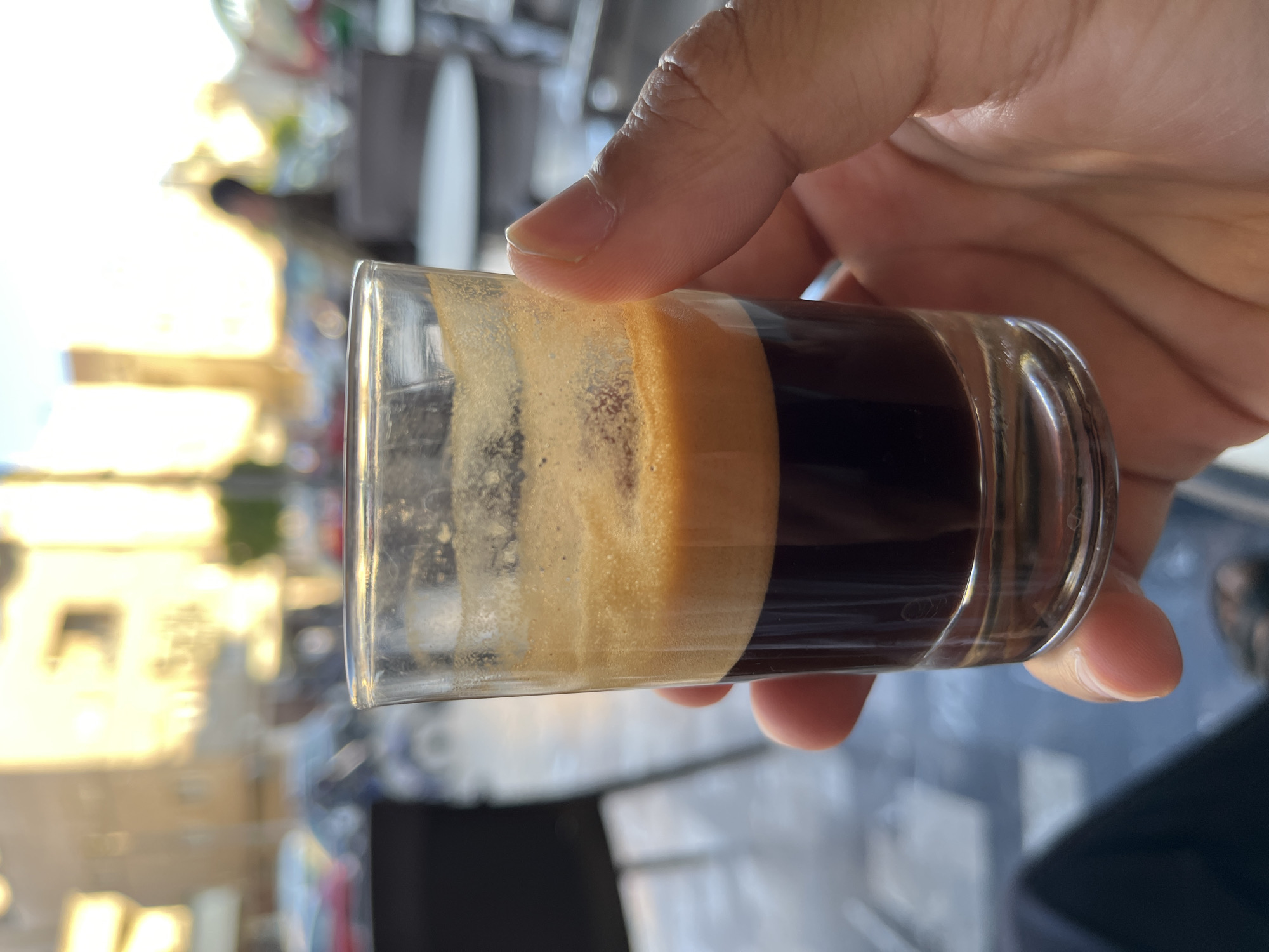- "A hand holds a small glass containing a layered coffee drink, likely an espresso, against a blurry, bright background" by FM-kXqx32, licensed under CC BY 4.0