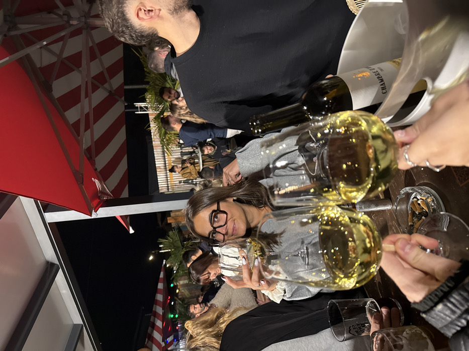The image depicts a nighttime social gathering at an outdoor patio or terrace in Andrézieux-Bouthéon, France. In the immediate foreground, two hands, one wearing a dark sleeve and the other adorned with rings, are raised in a toast, each holding a large stemless wine glass filled with a light yellow liquid, likely white wine. On the dark table surface, a white wine cooler bucket holds an inverted bottle of white wine, partially revealing the label "CHAMBRE D'..." and "2023." Adjacent to this, a glass ashtray containing numerous extinguished cigarette butts is visible. A glass with a dark beverage is also partially visible on the left. The central subject in the midground is a young adult female with long dark hair and prominent dark-framed glasses, wearing a grey long-sleeved top with ruffled cuffs. She holds a wine glass and looks towards the camera with a faint smile. To her right, the profile of a young adult male with short hair and a dark sweater is visible. The background reveals a lively, crowded environment featuring multiple individuals standing and seated at tables. Red and white striped parasols are deployed overhead, and the area is illuminated by string lights with multicolored bulbs and other artificial light sources. Potted plants, resembling palm trees, are interspersed among the patrons. The sky is dark, indicating the scene occurs after sunset.
