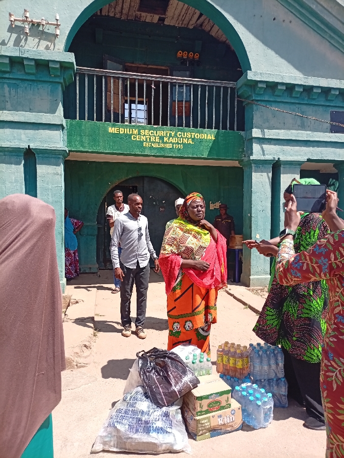 The image depicts an outdoor scene in front of the Medium Security Custodial Centre in Kaduna, Nigeria, established in 1915, as indicated by a prominent sign on the building's green facade