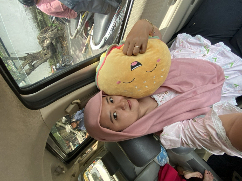 Inside a car, a woman with a pink headscarf rests against a yellow plush taco pillow