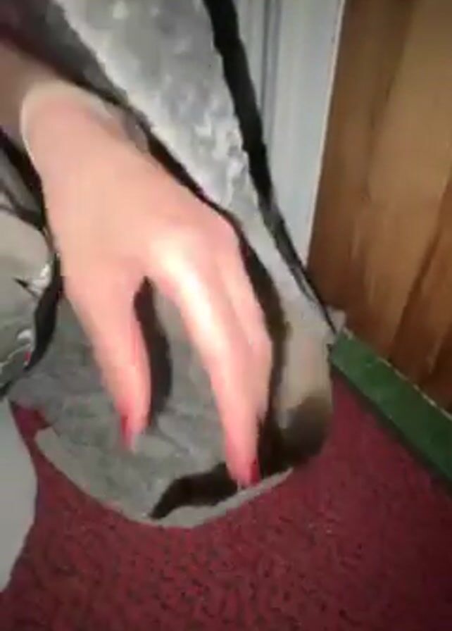 A person pulls a gray patterned blanket up and away, revealing a light-tan colored cat lying on a red patterned rug