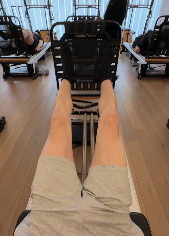 A first-person perspective video captures a man exercising with a "Cardio-Tramp" pilates reformer. The man, wearing gray shorts and black socks, extends and retracts his legs on the machine. Other similar machines and people exercising are visible in the background of the studio. The flooring is wooden. The room is brightly lit. A person walks back and forth in the background.