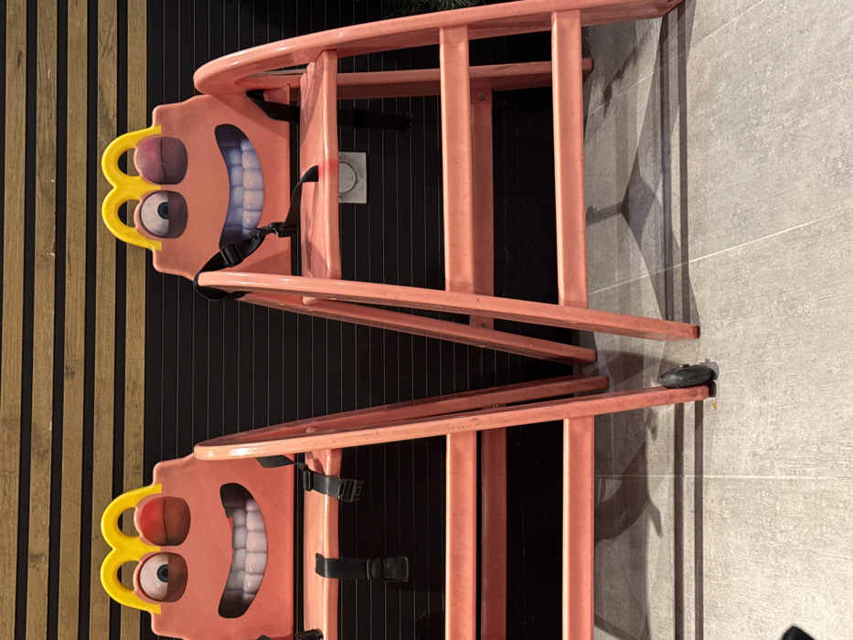 - "Two pink children's high chairs are stacked against a striped wall" by FM-9wXCm1, licensed under CC BY 4.0