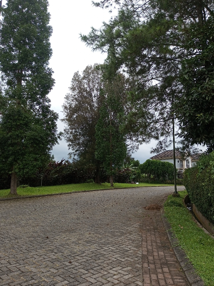 A paved brick road curves past verdant lawns and lush foliage. Tall, slender trees stand on either side, framing the scene. A house with a light-colored exterior and a tiled roof is partially visible amidst the greenery. The sky above is overcast. A lamp post stands near the road's edge.
