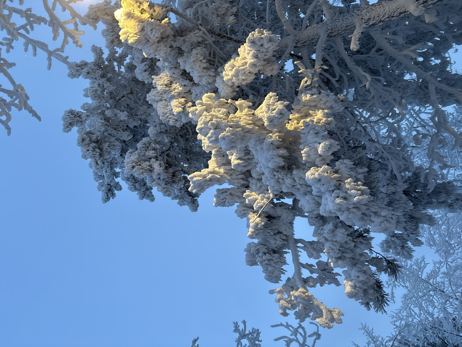 The image depicts a severe winter landscape in Krasnoyarsk, Russia, focusing on a large coniferous tree heavily encrusted with dense white rime ice or hoarfrost. The tree's branches and needles are entirely obscured by the thick crystalline accumulation, presenting a voluminous, textured form. The upper right portion of the tree is illuminated by a golden-yellow light, consistent with direct sunlight at a low angle, contrasting with the cooler, diffused light on the remaining frost and the clear, light blue sky that dominates the background. Out-of-focus, frost-covered branches of other trees are visible along the left and lower-left edges of the frame, indicating a natural, forested environment. No human subjects, animals, or discernible actions are present.
