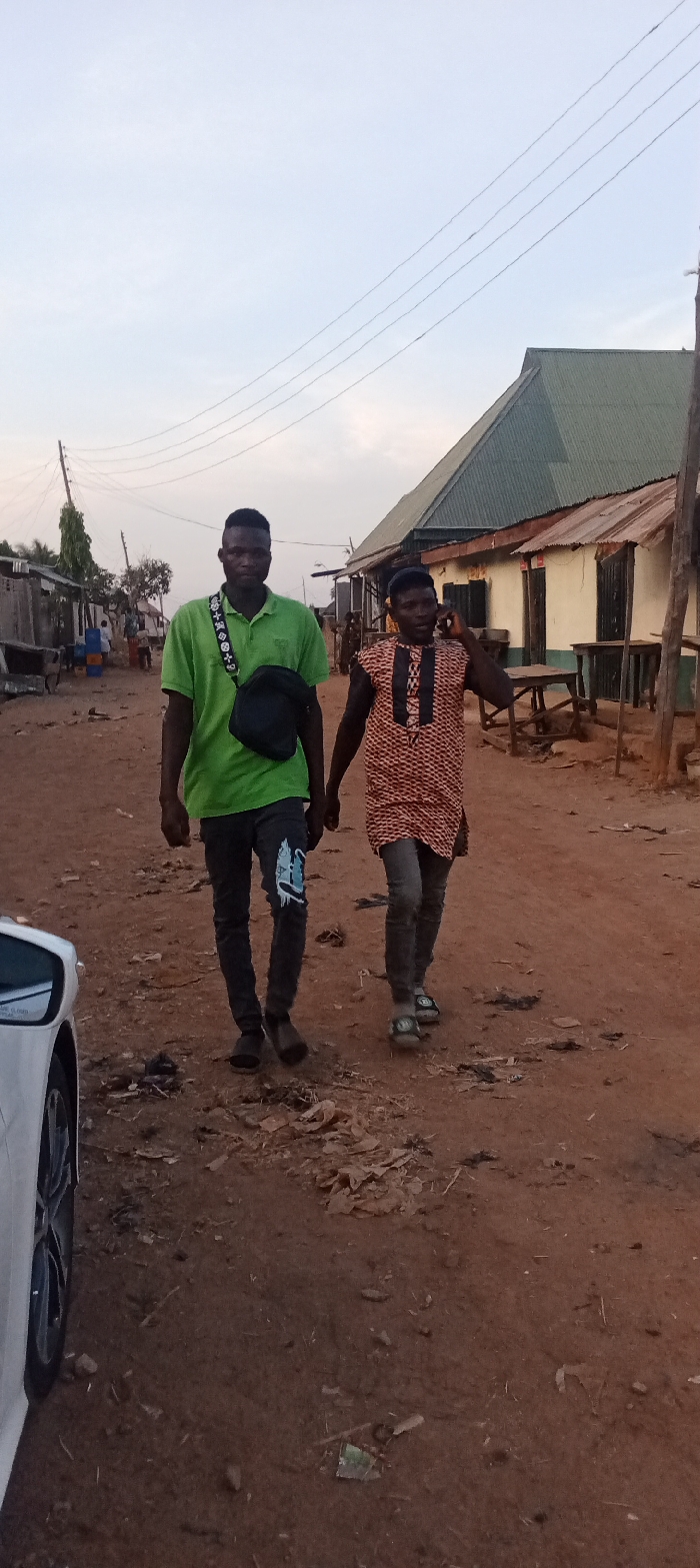 Two young men walk hand-in-hand down a dirt road in what appears to be a village or rural area