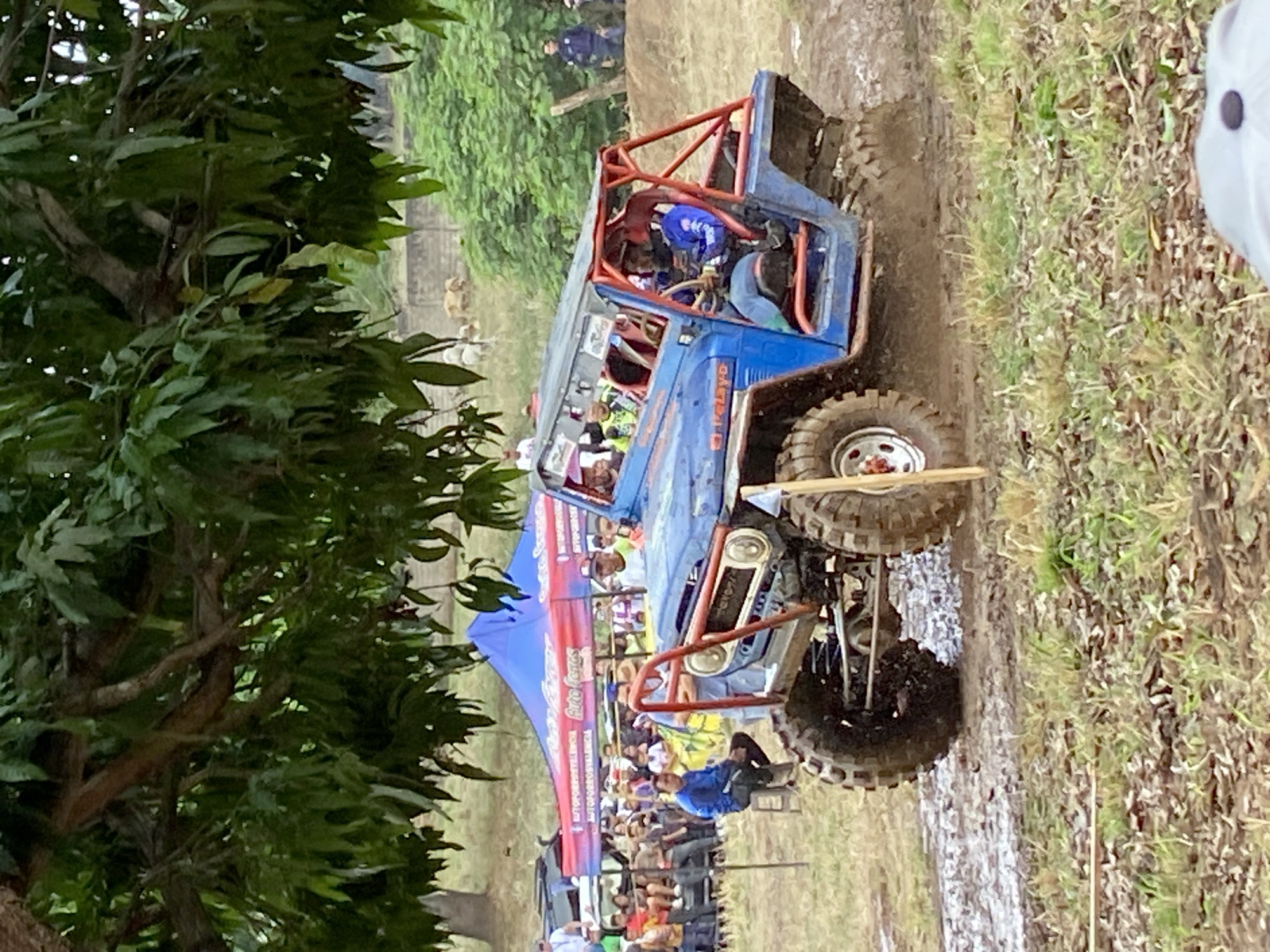 A blue off-road vehicle is navigating a muddy track, with a crowd of spectators visible behind a tent in the background