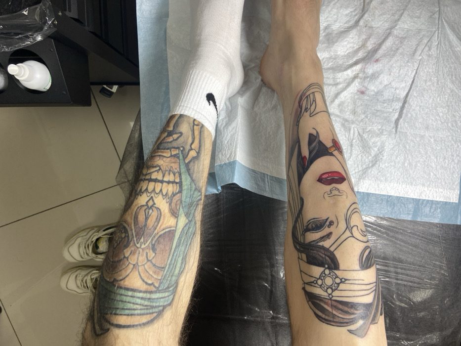 A pair of legs, one adorned with a fresh tattoo of a stylized woman's face featuring red lips and a jeweled headband. The other leg sports an older tattoo of a skull with wing-like shapes and a green band around it. One foot wears a white sock with a dark swoosh, while the other is bare. They are resting on a surface covered with a disposable blue and white surgical drape. The background includes white sneakers and a black table.