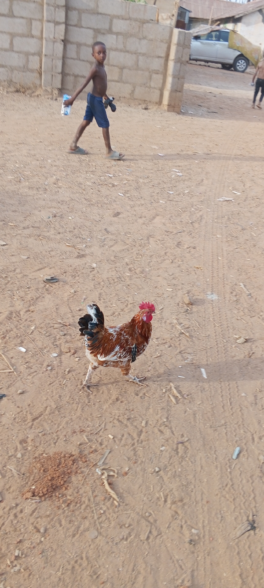 The image depicts an outdoor scene in Keffi, Nigeria. In the foreground, a brown, white, and black rooster with a red comb and wattle walks left-to-right across a light brown dirt ground. The ground is unpaved, uneven, and contains tire tracks, small rocks, and sparse dry vegetation debris. In the midground, a young boy with dark skin, shirtless and wearing dark blue shorts and light-colored sandals, walks right-to-left. He holds a light blue rectangular object in his left hand and a dark object in his right hand. His gaze is directed towards the viewer. Behind the boy, a low wall constructed from large, light-colored concrete blocks is visible. In the background, to the right, a silver sedan is parked, partially covered by a yellow fabric. Other indistinct structures, possibly residential, are present further in the distance. Another individual's lower legs are partially visible on the far right. The scene is brightly lit by natural light.