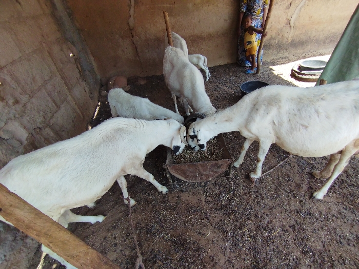 Four white goats with black markings are eating from a metal trough in a dirt-floored enclosure. The enclosure is partially covered with a thatched roof and appears to be part of a larger compound. The goats are all facing towards the trough and eating the food within. There is a wooden beam in the foreground, extending from the wall to the right side of the frame. The goats are in a pen at the coordinates 10.852, 11.426 in Bajoga, Nigeria. The goats are likely being raised for their meat, as is common in Nigeria. The scene is characterized by the goats' focus on eating, suggesting a natural and ordinary routine for these animals.