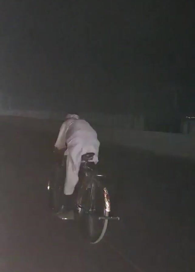 A man in white clothing is riding a bicycle on a paved road at night. The road is dark, with some light from oncoming traffic in the distance. The man's shadow is visible on the road behind him. The bicycle has a rack over the rear tire. There are buildings visible to the right, slightly illuminated. The sky is dark.
