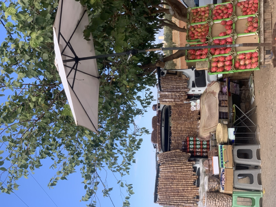 - "An outdoor vendor setup is present on an unpaved surface in Majjate, Morocco, partially shaded by a mature tree with green foliage" by FM-db0142, licensed under CC BY 4.0