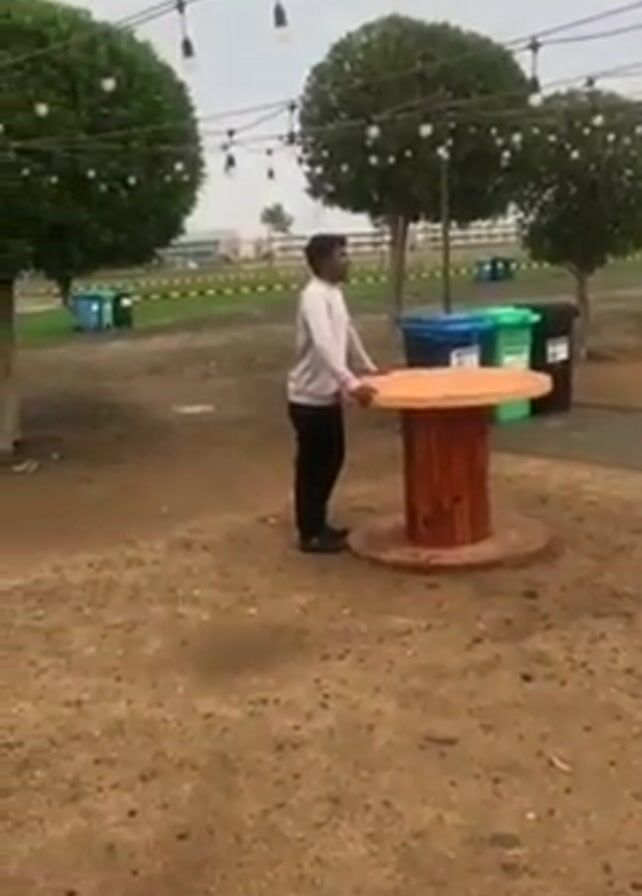 two men outdoors in a park-like setting. The background includes short trees with spherical tops aligned in a row, with string lights strung above. Several trash bins are also in the background. The ground is covered in light brown dirt. The first man, wearing a long-sleeved white shirt and dark pants, stands near a round, orange-topped table with a wooden spool base. He walks a few steps to greet a second man, who is wearing a dark top with purple accents and dark pants. They extend their hands and high-five.