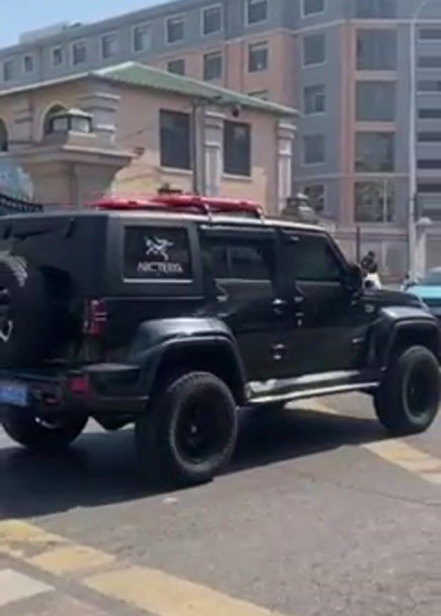 A black SUV crosses the street in front of a building. The car is customized with a spare tire on the back, extra lights on the roof, large tires, and an "Arc'teryx" logo on the window. Other cars are on the street as well as pedestrians. The day is sunny.