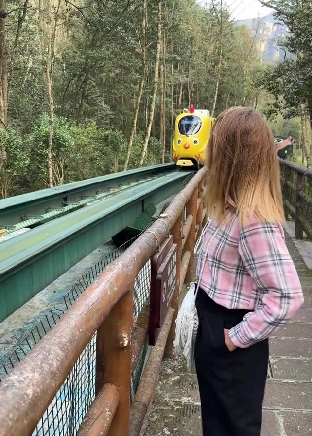 A woman is standing on a stone bridge in a wooded area, watching a small yellow train pass by. The train is shaped like a chick. The bridge has a green painted metal track with a wooden handrail. The woman is wearing a pink and white plaid shirt, black pants, and white sneakers. She has sunglasses tucked into the neck of her shirt. She turns and smiles at the camera before looking back at the train. There are other people walking in the background.