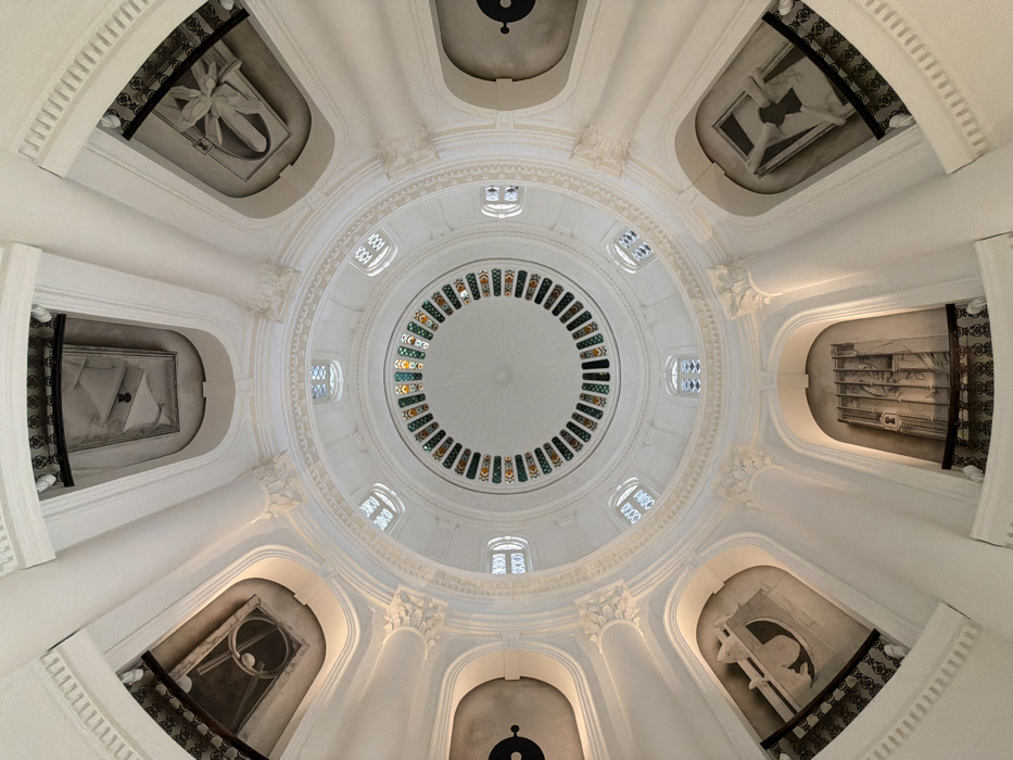 An upward view inside a building reveals a white dome adorned with a ring of stained glass. Six archways surround the dome's base, each containing sculpted elements or statues behind decorative ironwork. The dome is punctuated by small windows. The architecture exhibits a classic style with columns and ornate details. The image captures the intricate design and grandeur of the building's interior.