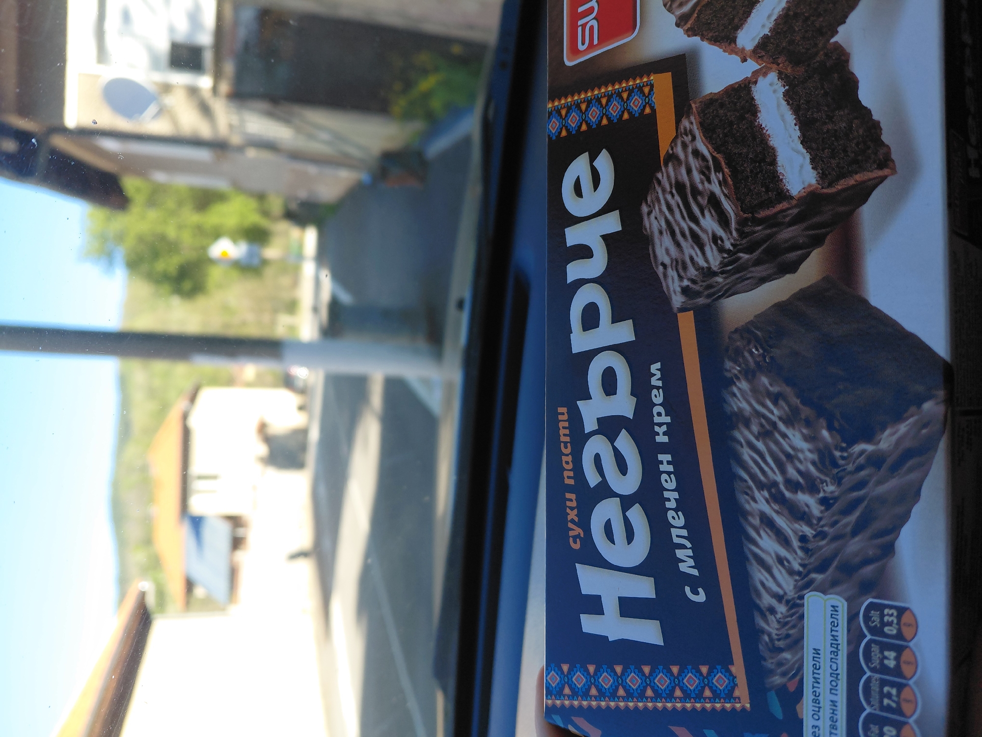 Here is a description of the image: The image shows a box of Bulgarian "Negarče" (Негърче) pastries, translated as "Little Negro," visible from the top and right side. The box features images of chocolate and cream pastries. The backdrop, seen through a window, appears to be a street scene in a village. A building with a satellite dish is visible, as is a street with a curb, leading to trees and another house. The image is slightly blurred and has a soft focus due to the window's glass.