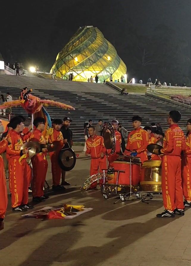 A group of people are wearing red outfits and performing music in front of a building. They are playing drums, gongs, and cymbals. There is also a person holding a dragon puppet. The building is in the background and has a unique, modern design. People are standing around watching the performance. It is nighttime.