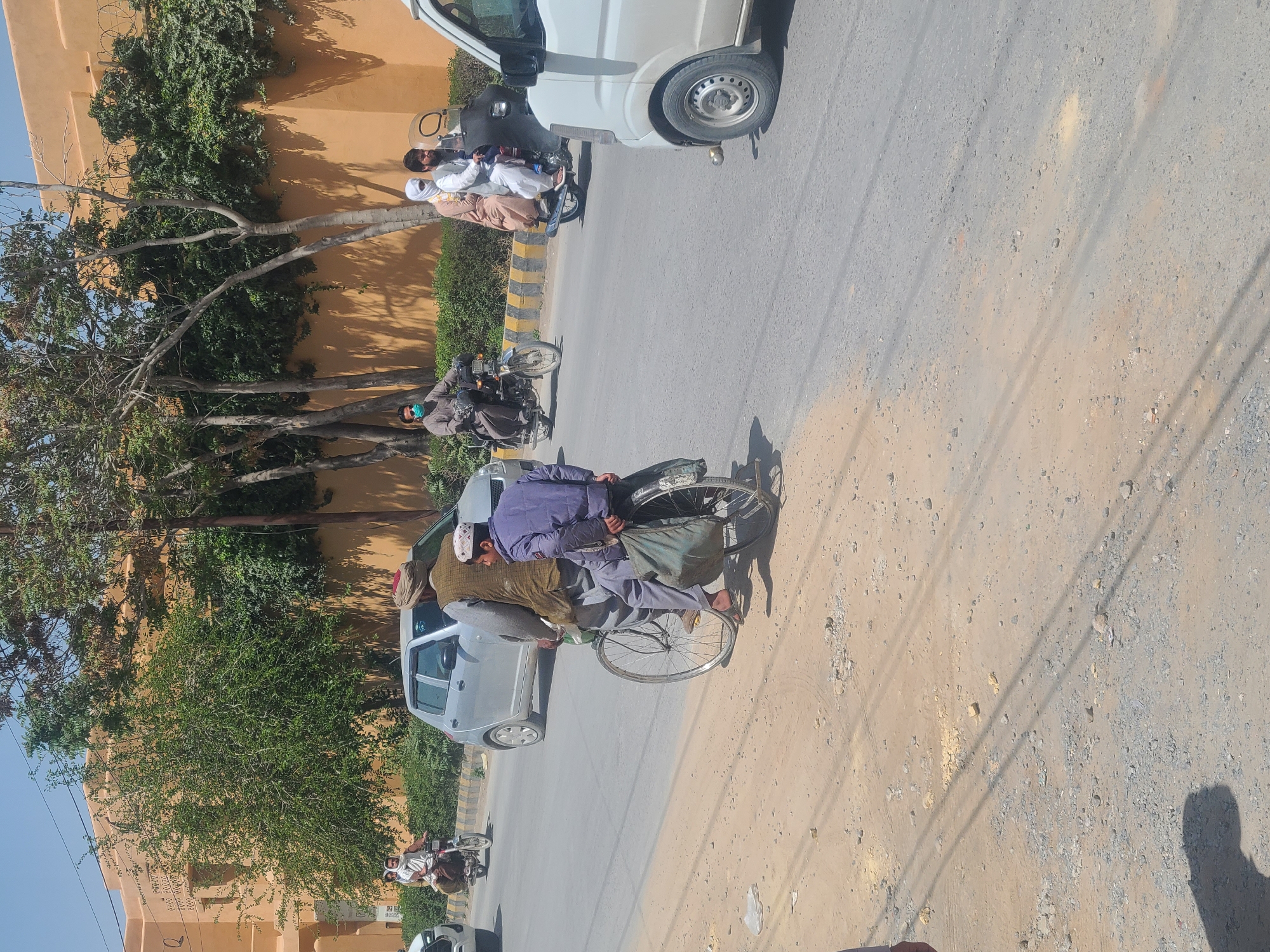 street scene in Quetta City Tehsil, Pakistan. In the foreground, two men ride a bicycle rickshaw on a paved road. A silver car is next to them. In the background, motorcycles and a white van travel on the same road, bordered by a tree-lined median. A tall, tan-colored wall stands adjacent to the sidewalk. Overhead power lines cast diagonal shadows on the ground. The sky is clear blue.