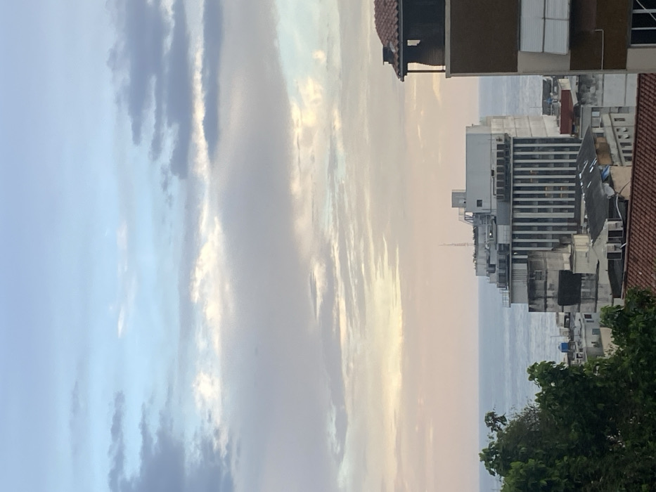 cityscape with a large body of water in the background. Tall buildings are clustered together, with a variety of architectural styles. The sky is filled with clouds, and the overall lighting suggests it is either sunrise or sunset. Some greenery is visible in the foreground, possibly trees or shrubs. The buildings seem to be located near the coast.