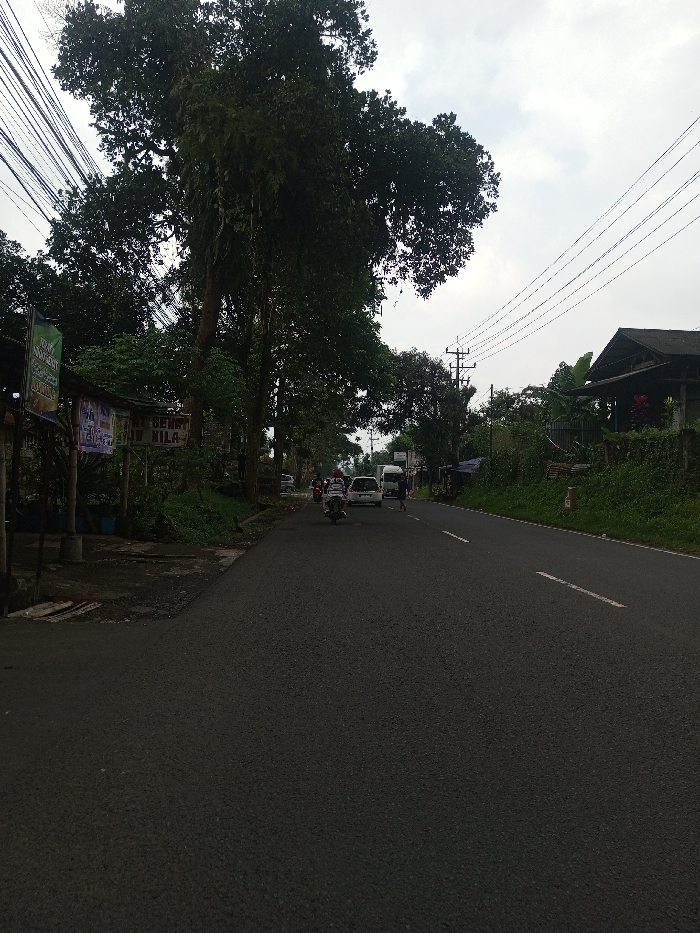 The image portrays a two-lane asphalt road in Sandamal Eliya, Sri Lanka, under an overcast sky. The road features a solid white line along its right shoulder and a broken white center line visible further into the distance. On the left side, a dirt shoulder gives way to a small, open-fronted commercial structure. This structure displays multiple signs, including green and white banners partially reading "ANGKRINGAN" and "AYAM GEPREK," with another sign below showing "NILA." Tall, dense trees with dark green foliage line this side of the road, with a cluster of overhead power lines running vertically near the left frame edge, partially obscured by the canopy. On the right side, an embankment covered in thick green vegetation slopes upwards from the road, with a small, light-colored marker post embedded in the foliage. Behind this, a single-story building with a dark-colored roof is visible, surrounded by dense greenery. Multiple overhead power lines extend horizontally across the upper right, supported by a visible utility pole in the mid-ground. Traffic present on the road includes a white motorcycle carrying two helmeted occupants, traveling away from the viewer. A white sedan follows directly behind the motorcycle. Further down the right side of the road, a pedestrian in light-colored clothing walks away from the camera, and a dark-colored van or small truck is also visible. The scene is lit by diffused daylight, indicating cloudy conditions.
